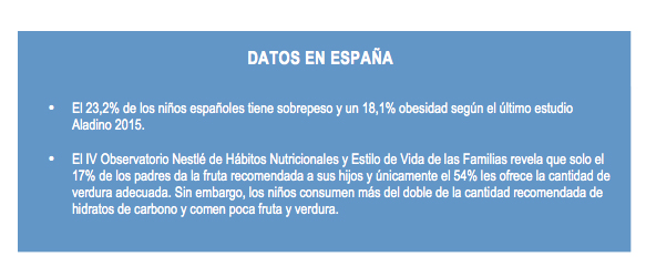 El último estudio Aladino 2015 revela que más de un 23% de los pequeños en España tiene sobrepeso y más de un 18% obesidad. Mantener las proporciones adecuadas de cada grupo de alimentos según la edad del niño es la clave de una alimentación equilibrada. Las verduras deben ocupar la mitad del plato y las carnes e hidratos de carbono un cuarto respectivamente. Sin embargo, en la realidad, estas proporciones están invertidas en la mayoría de los hogares españoles, siendo los hidratos de carbono los que ocupan más del 50% del plato de los pequeños de la casa en lugar de las verduras.